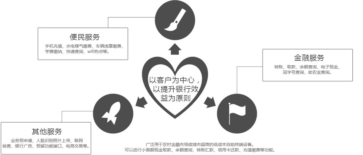 為幫助解決銀行業面臨的互聯網金融、金融脫媒、利率市場化、行業競爭加劇、成本高、盈利下降等挑戰,同時響應國家助農政策號召。 我司研發一款專門針對農村金融市場或商超等特定場景而開發的可以查詢,轉賬,取現,收單、信用卡還款,手機話費充值等,同時可疊加本地特色業務(水、電、煤代繳、助農補貼、社保等)的柜立式金融便民終端。終端可解決銀行ATM機網點固定、單一且投放量不足的問題。整機總體高度約140cm,外觀設計符合人體工程學,操作舒適